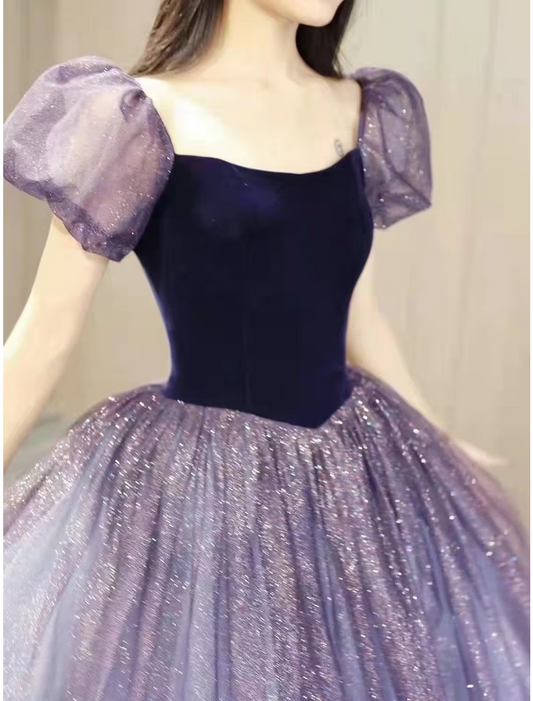 Ball Gown Prom Dresses Cute Dress Engagement Floor Length Short Sleeve Square Neck Tulle with Sequin Splicing