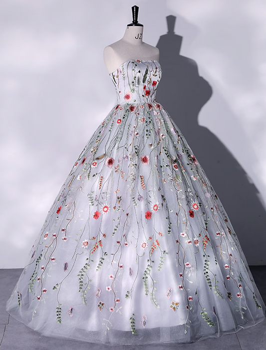 Grey Ball Gown 3D Flowers Princess Party Gown, Sweet Formal Dress Grey Formal Dress