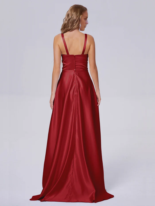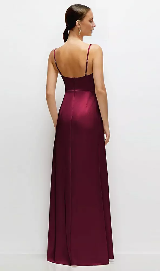 Thin shoulder strap pleated satin side slit and floor length bridesmaid dress - LD Dress