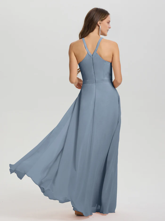 A-line hanging neck collar sleeveless and floor chiffon bridesmaid dress