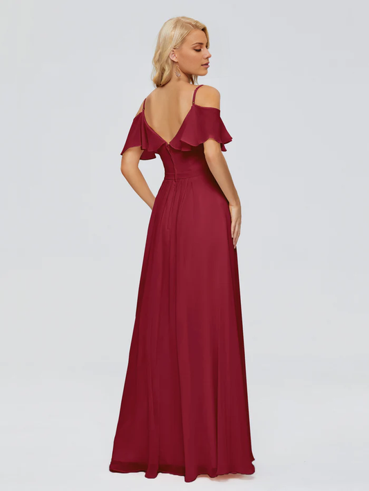 Off shoulder thin shoulder strap ruffled chiffon bridesmaid dress