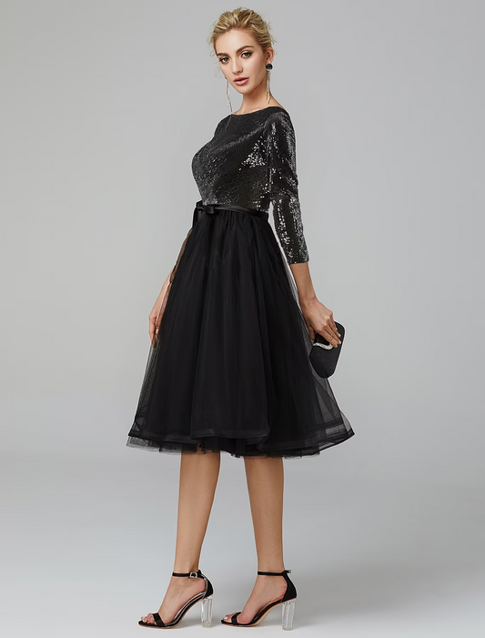 A-Line Cocktail Dresses Sparkle & Shine Dress Formal Tea Length 3/4 Length Sleeve Jewel Neck Tulle with Sequin Strappy