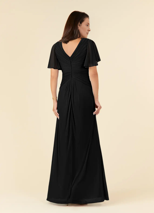 A-line V-neck pleated mesh and floor length mother of the bride dress