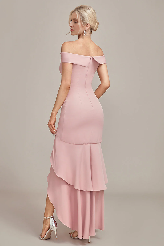 Pink mermaid off shoulder asymmetrical ruffle hem, mother of the bride dress