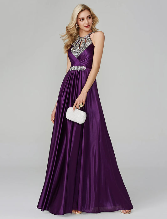 A-Line Little Black Dress Dress Party Wear Floor Length Sleeveless Halter Silk Backless with Crystals Sequin