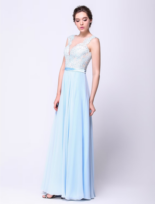 Ball Gown Open Back Dress Holiday Floor Length Sleeveless Plunging Neck Chiffon with Beading Appliques