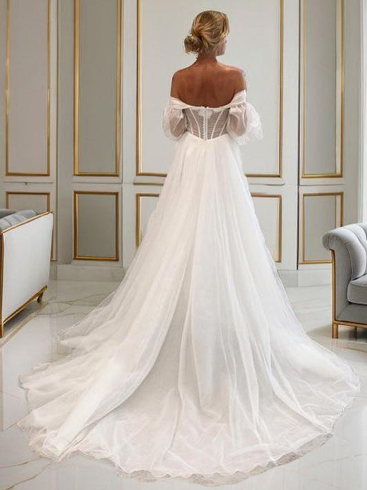 A-line Off Shoulder Long sleeved Applique Lace Palace Dress Tulle and Floor Length Wedding Dress