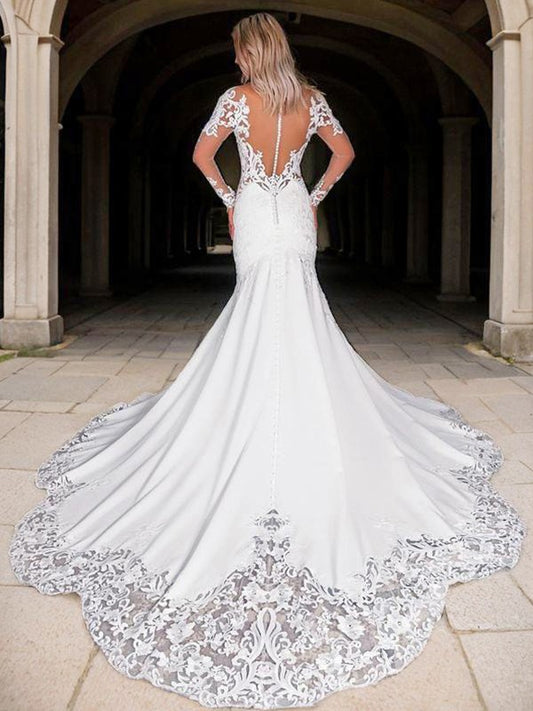 Mermaid Scoop Long Sleeves Appliques Lace Cathedral Train Stretch Crepe Wedding Dress