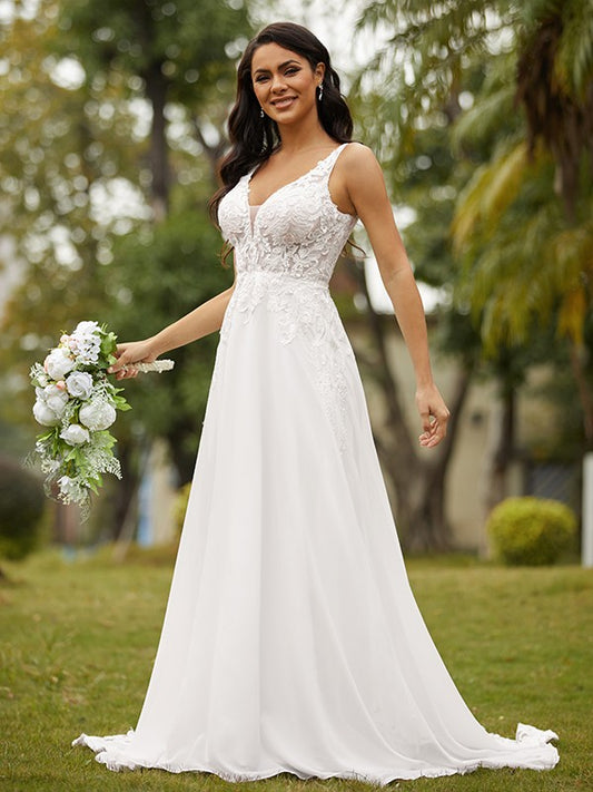 A-Line/Princess Chiffon Lace V-neck Sleeveless Court Train Wedding Dresses