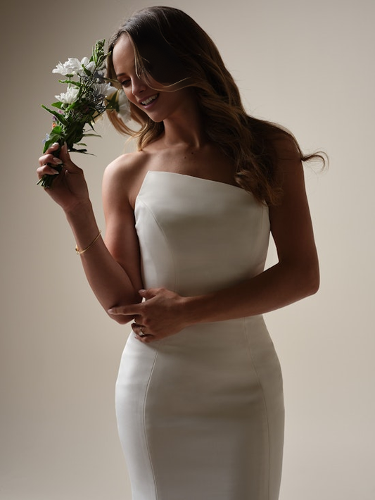 Simple off shoulder Bohemian style strapless and floor length wedding dress