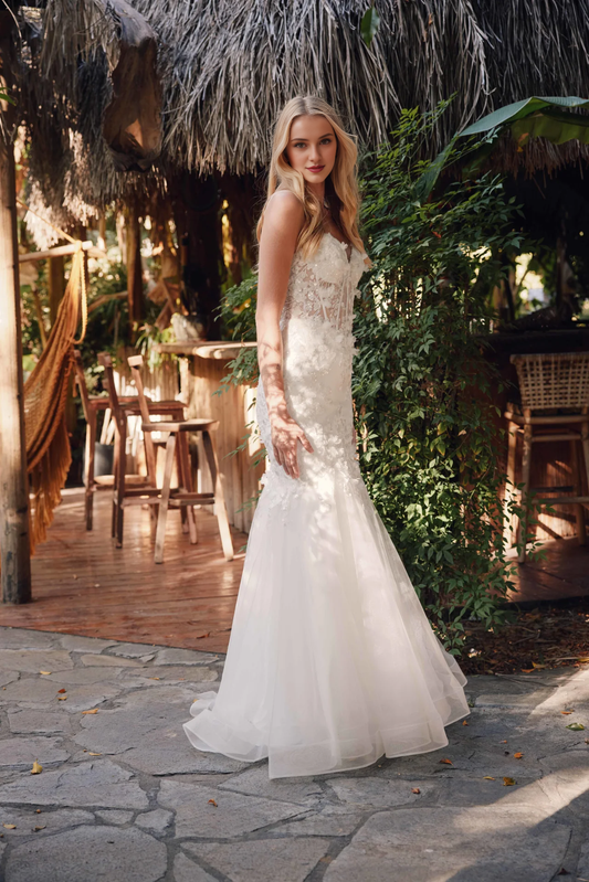 Embroidered applique long sleeveless V-neck sheer wedding dress