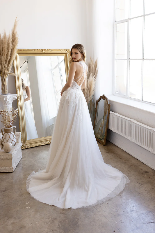 Embroidered lace applique long sleeveless hanging neck wedding dress