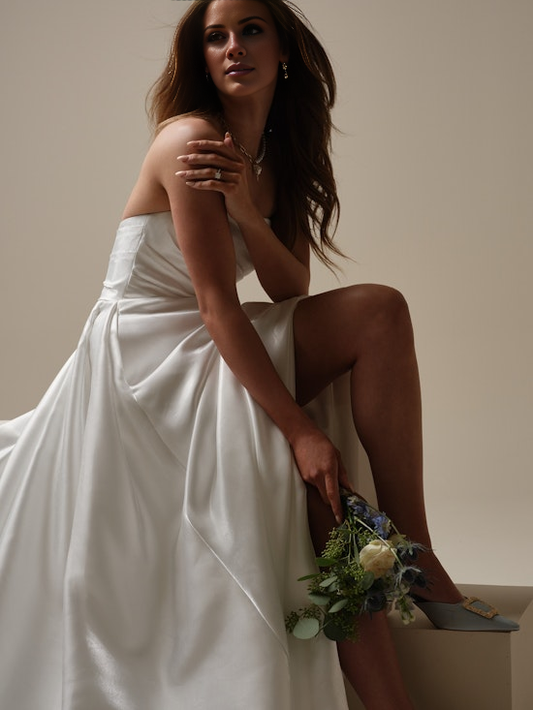 Asymmetric strapless sweetheart neck and floor length wedding dress