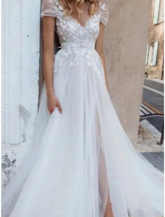 Beach Formal Wedding Dresses A-Line V Neck Short Sleeve Sweep / Brush Train Lace Bridal Gowns With Pleats Appliques