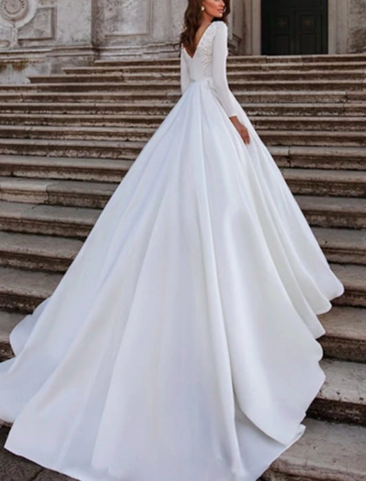 Engagement Royal Style Formal Wedding Dresses Ball Gown Scoop Neck Long Sleeve Court Train Satin Bridal Gowns With Beading Appliques