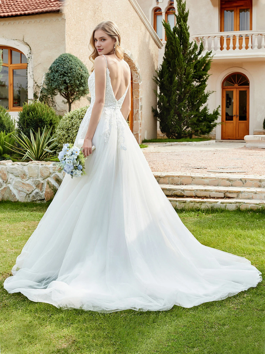 Deep V-neck decal A-line wedding dress