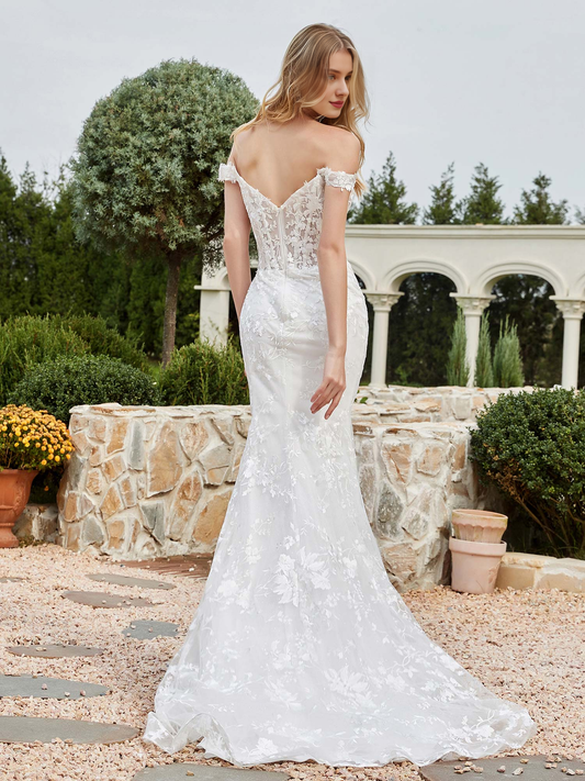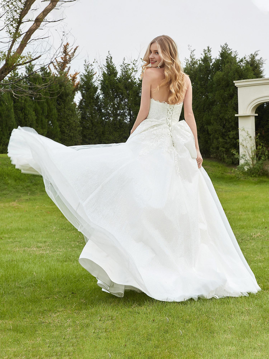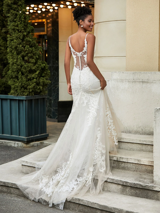 Thin shoulder strap V-neck lace tight corset with appliqu é wedding dress