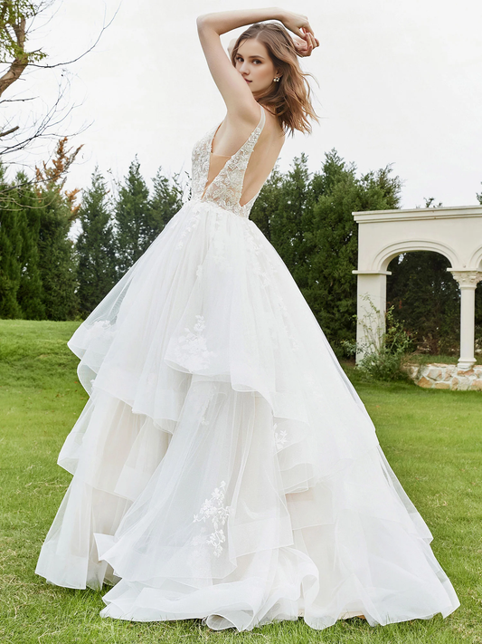 Lace tight corset V-neck sleeveless ruffled wedding dress