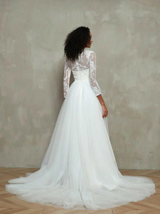 V-neck lace dress with ruffled edges and thin gauze wedding dress