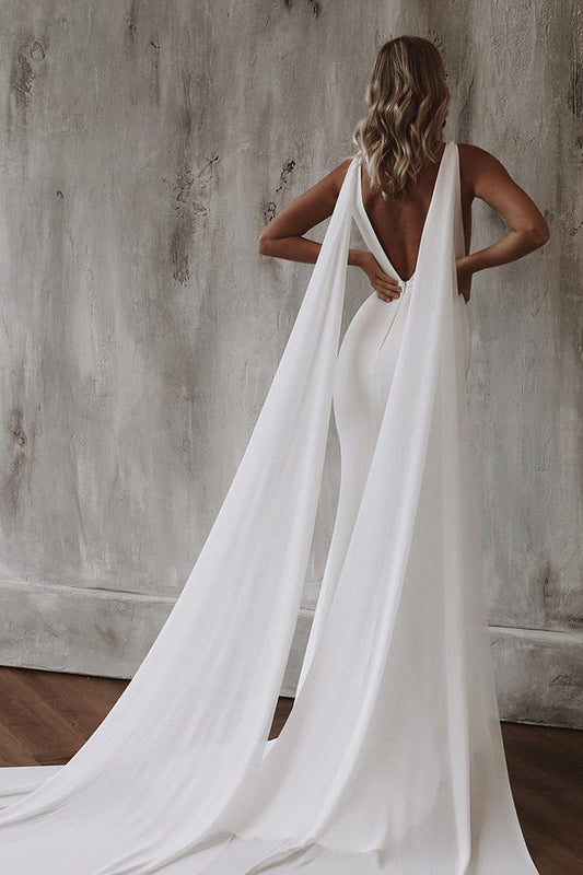 Sexy deep V-neck ivory minimalist fishtail wedding dress