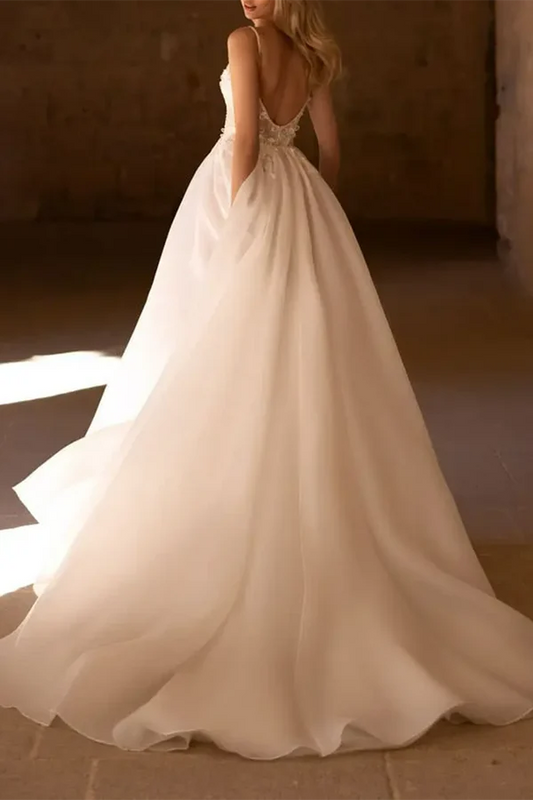 A-shaped deep V-neck sheer bohemian style wedding dress beach bride dress