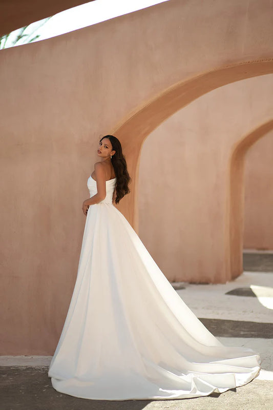 Fashionable strapless long sleeved minimalist satin fishtail wedding dress