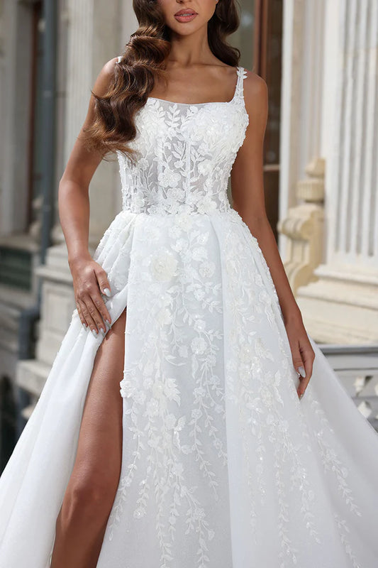 A-line Square Neck Lace Applique High Split Palace Trail Countryside Style Wedding Dress