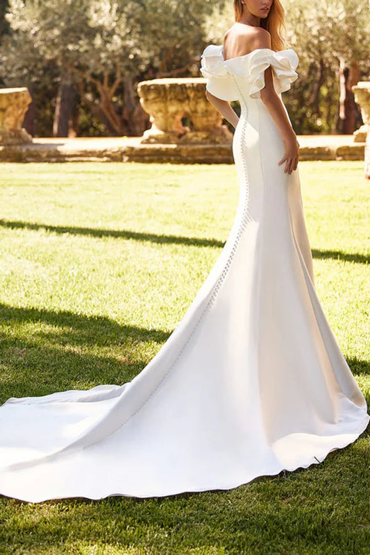Unique off shoulder ruffled satin fishtail wedding dress paired with court train
